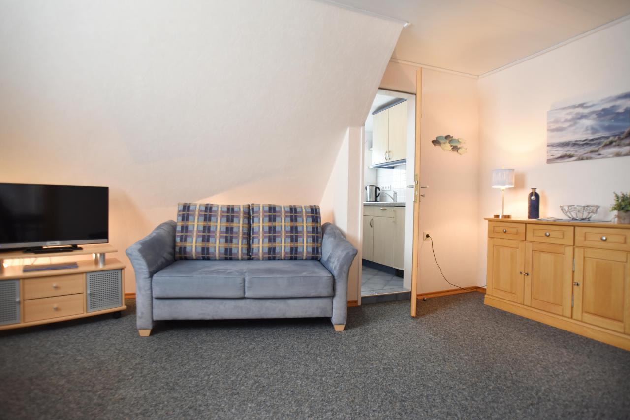 Ferienwohnung in der 1. Etage mit Blick Richtung Süden auf das Meer, den Hafen, und das Ostende von Norderney mit den Seehundbänken. Schlafzimmer mit Doppelbett 180 x 200 cm und Kleiderschrank, Wohnbereich mit Sitzecke, Sofa und Sat-TV, separate Küche mit Cerankochfeld und Geschirrspüler, Duschbad mit Fenster.