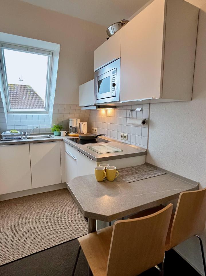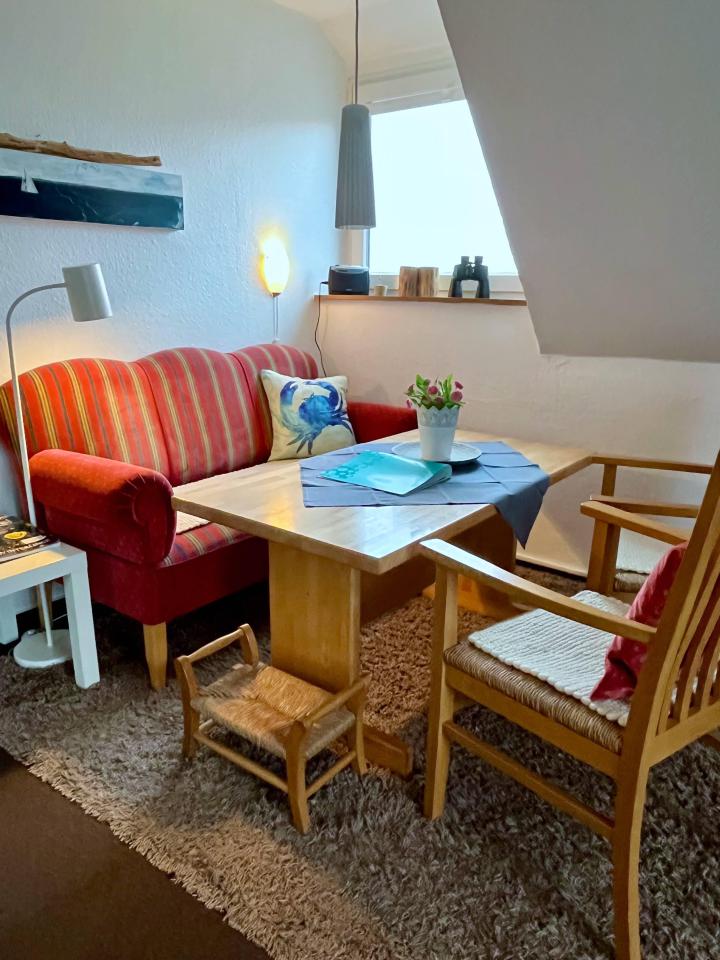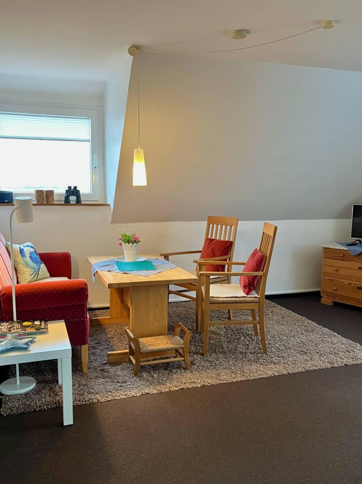 Unser großes Apartment „Reemt“ bietet Platz für bis zu 4 Personen auf etwa 60m². Die Wohnung und besteht aus einem Schlafraum, einer Kochnische, Bad (Dusche/WC) sowie einem Wohnbereich. Das helle Wohnzimmer dieses Apartments bietet Ihnen freien Ausblick Richtung Osten, über die Hellerwiesen bis zum Hafen. Hier können Sie gemütlich auf einem handgefertigten Ostfriesensofa oder einem Schaukelsessel Platz nehmen, ein Buch lesen, fernsehen, im Internet surfen oder einfach nur entspannen.