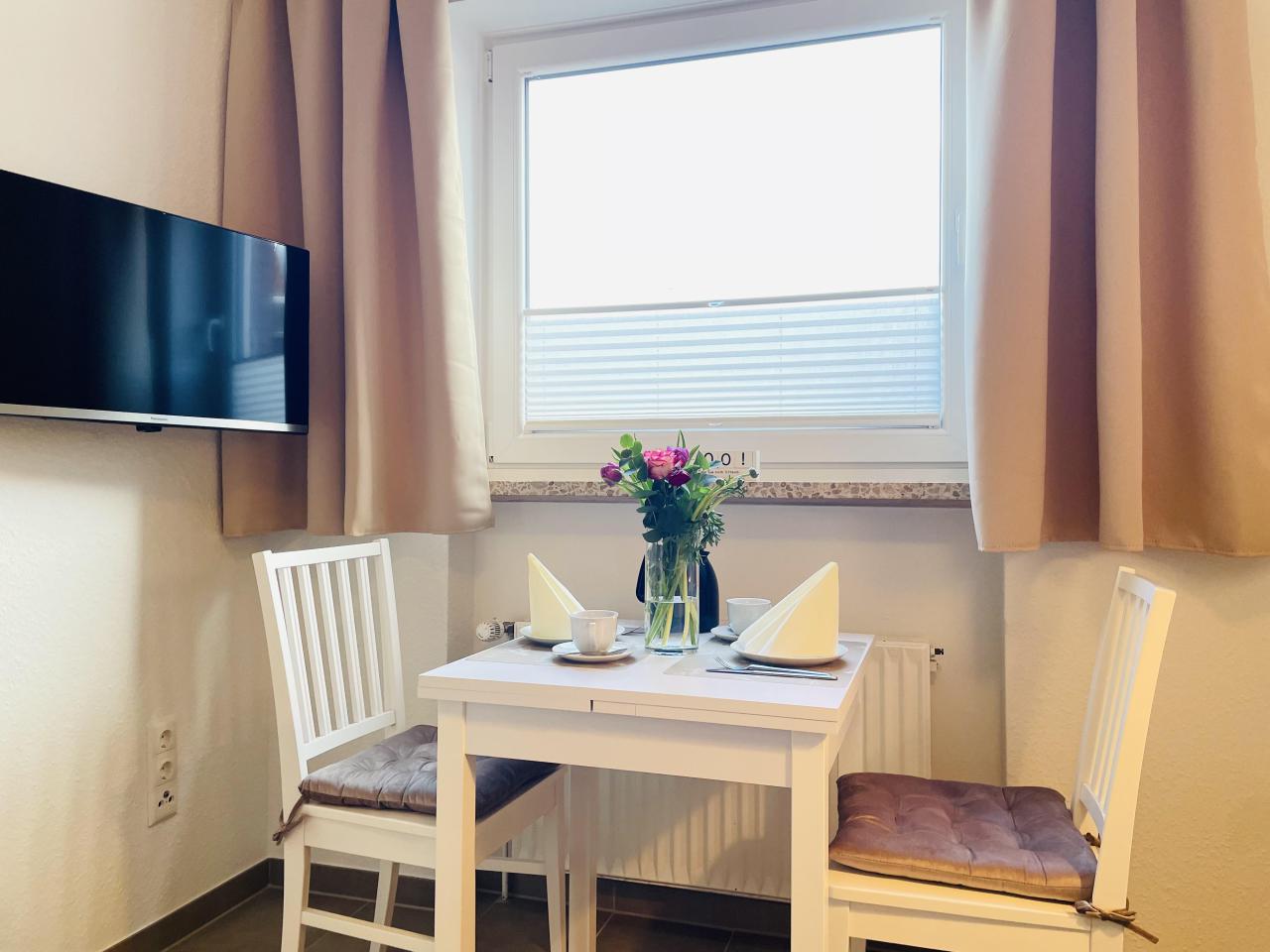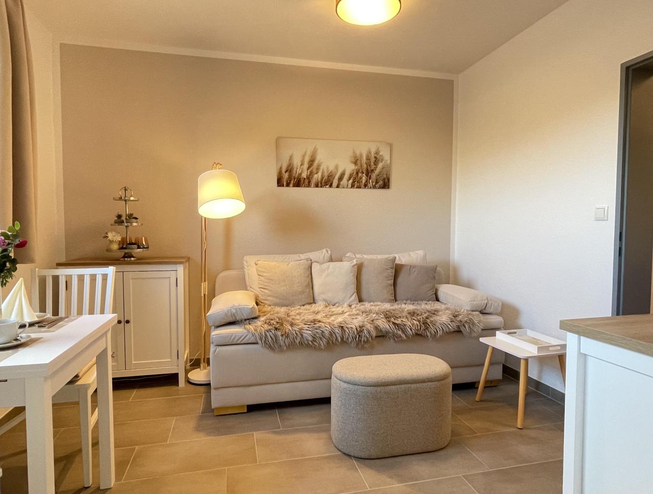 Die kernsanierte Ferienwohnung (Feb. 2026) liegt halb im Untergeschoss. Sie ist unterteilt in Wohnzimmer, Schlafzimmer (die Betten sind wahlweise zusammen oder einzeln stellbar), neue Küche mit Spülmaschine (Feb. 2026), Badezimmer sowie Flur. Die Wohnung ist barrierefrei erreichbar, der Bodenbelag sind Fliesen. Die Wohnung ist für Allergiker geeignet. Die Sonnenterrasse und der Strandkorb am Haus stehen zur Nutzung gerne für Sie bereit.