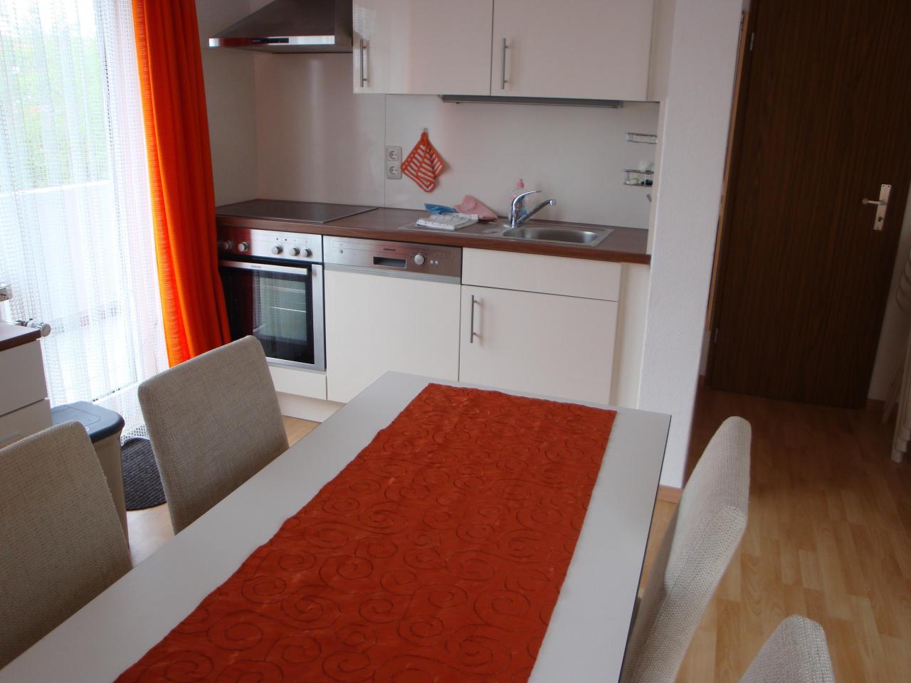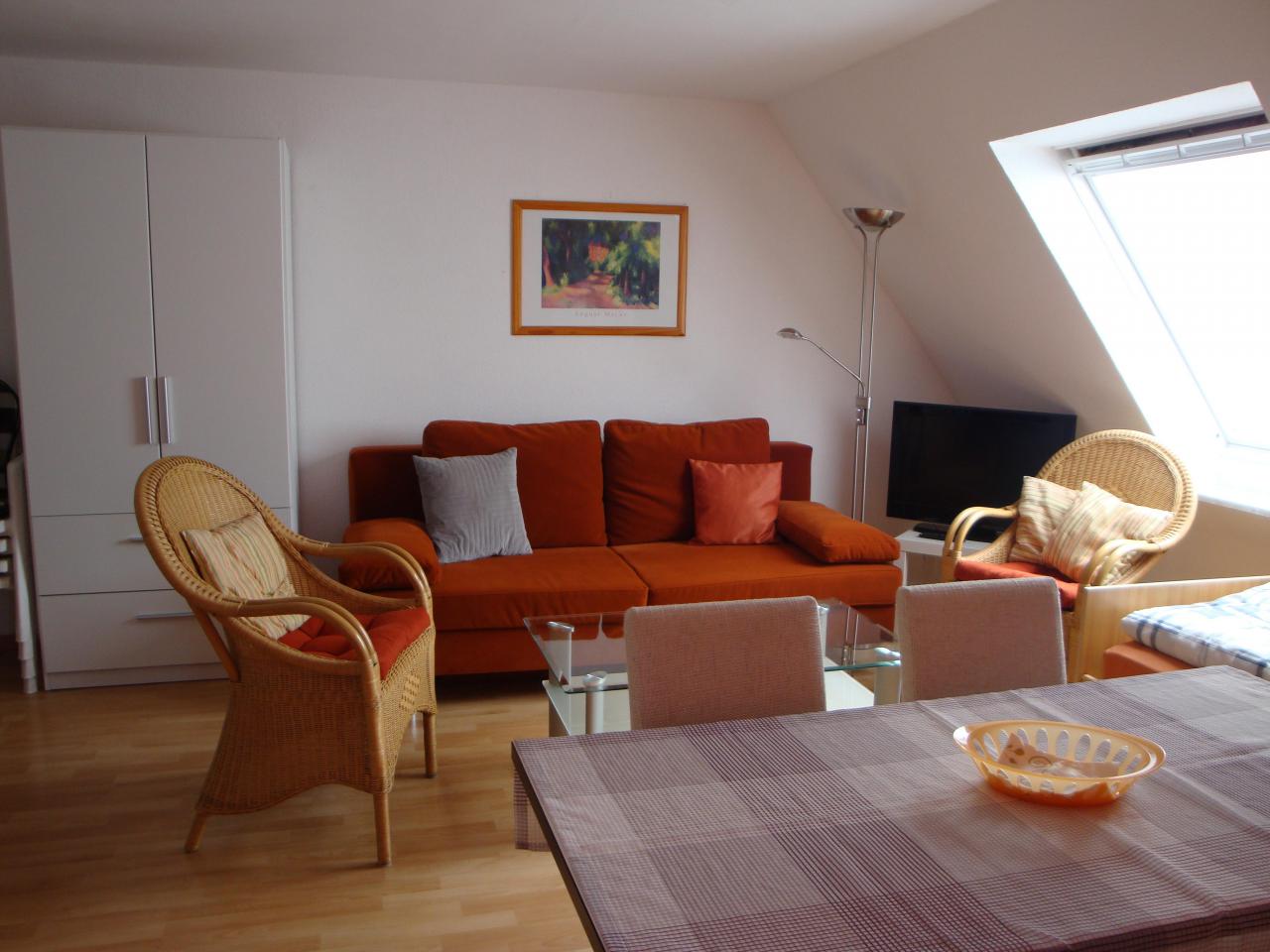 Schöne helle 2-Zimmer-Whg. mit Balkon im 1. OG ( od. 2-Zi.-Whg. im Hochparterre mit 2 Balkonen) , bei Sonne lichtdurchflutet, für 2-4 Pers., im Wohnraum eine Nobilia-Einbauküche (mit Geschirrspülmaschine, Ceranfeld, Backofen). Im Wohnschlafraum ein gutes Federkern-Schlafsofa, auf 1,60 m Breite ausziehbar (im 1.OG + 1 Bett), im. Schlafraum:2 Boxspring-Betten (bei der Whg. im Hochparterre + 1 drittes Bett), im Wohnraum schöner Essplatz, Sat-Flachbild-TV, kleines weißes Duschbad mit Fenster, Laminatboden. Der Schlafraum und das Bad gehen direkt vom Wohnraum ab (ohne sep. Flur).