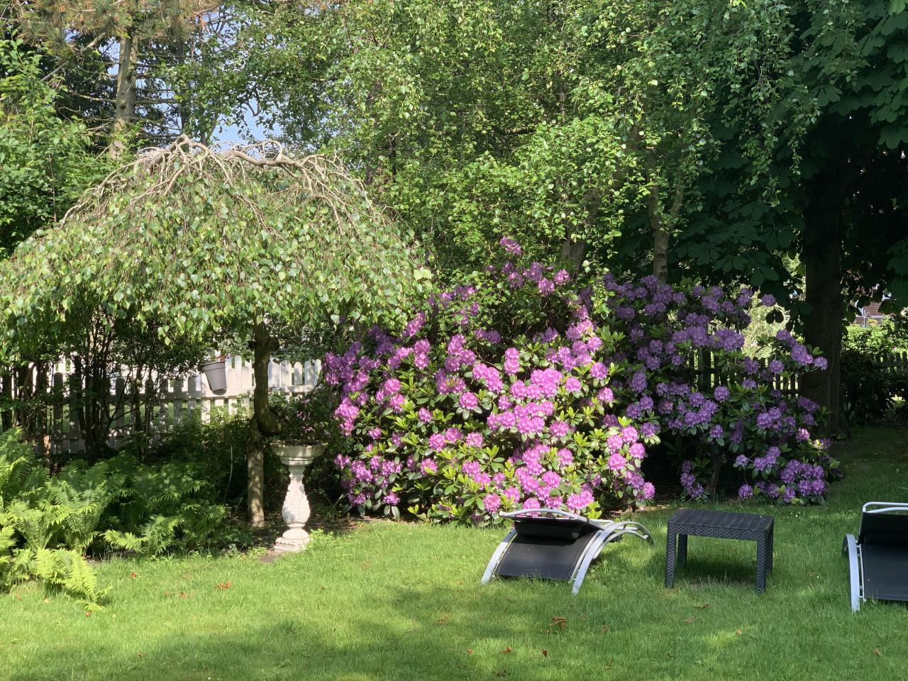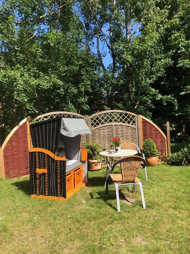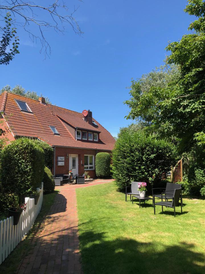 Ruhige, reizvolle Lage unserer Pension mit Zimmern und Appartements zwischen Wattenmeer und den grünen Dünen, mit einem geschützt liegenden Garten mit Liegewiese und Sitzecken zur Erholung "pur".