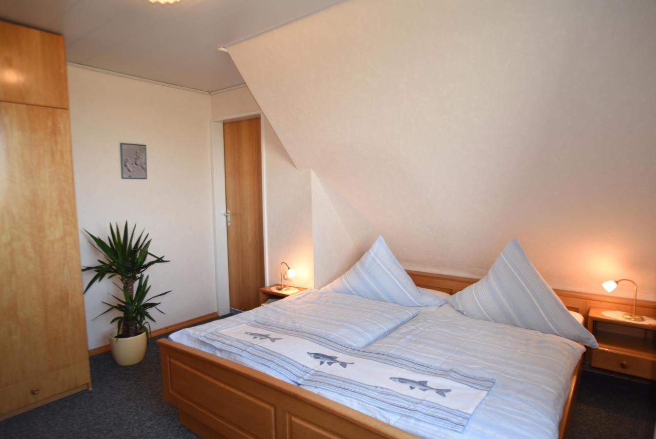 Ferienwohnung in der 1. Etage mit Blick Richtung Süden auf das Meer, den Hafen, und das Ostende von Norderney mit den Seehundbänken. Schlafzimmer mit Doppelbett 180 x 200 cm und Kleiderschrank, Wohnbereich mit Sitzecke, Sofa und Sat-TV, separate Küche mit Cerankochfeld und Geschirrspüler, Duschbad mit Fenster.