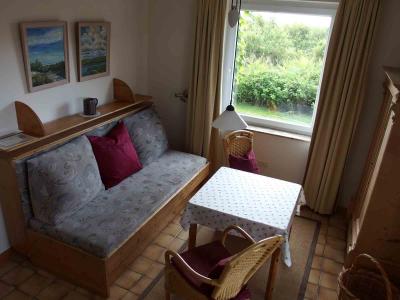 1 Schlafraum, 1 Wohn-/Schlafraum, Dusche/WC, Küchenzeile mit Geschirrspülmaschine, Durchwahltelefon (kostenlos ins dt. Festnetz), Südblick aufs Wattenmeer; Mindestmietdauer Hochsaison 14 Nächte