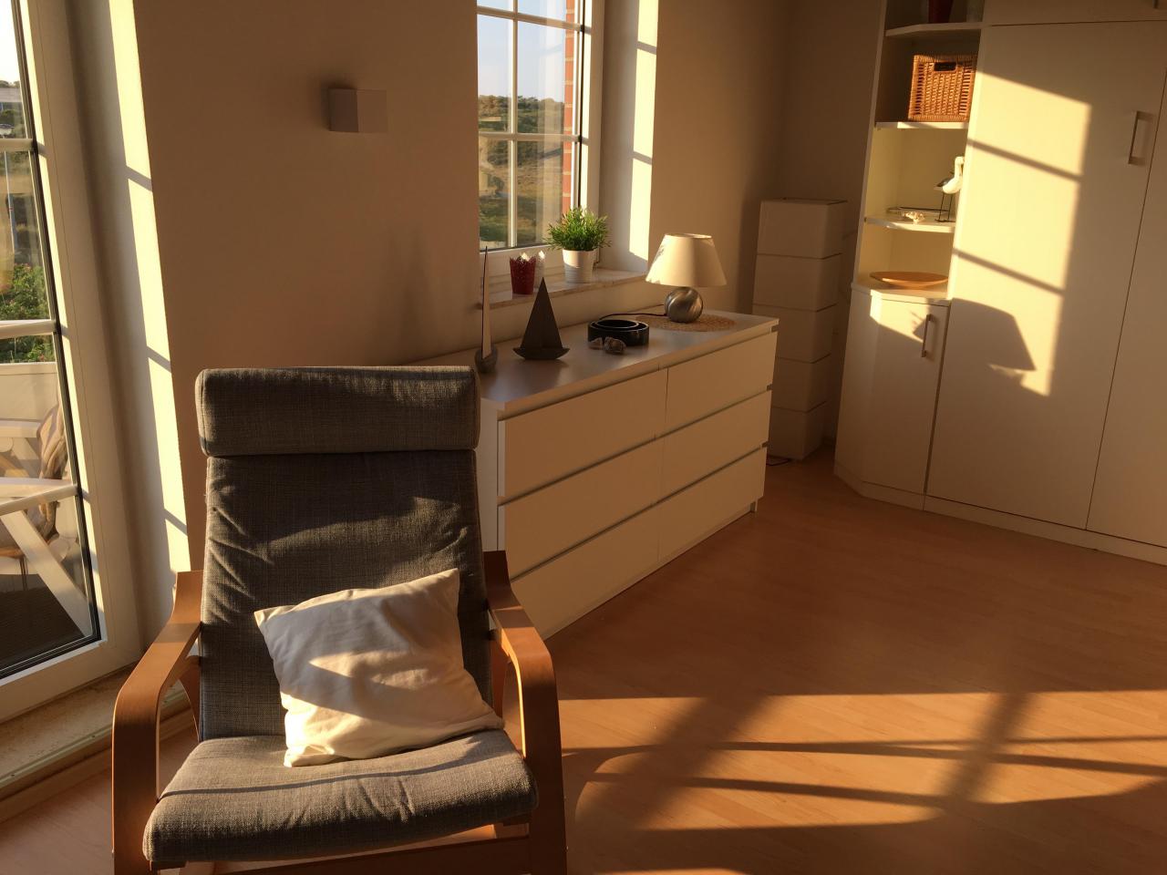 Küche mit gemütlicher Essecke, Duschbad und Balkon mit herrlichem Dünenblick.